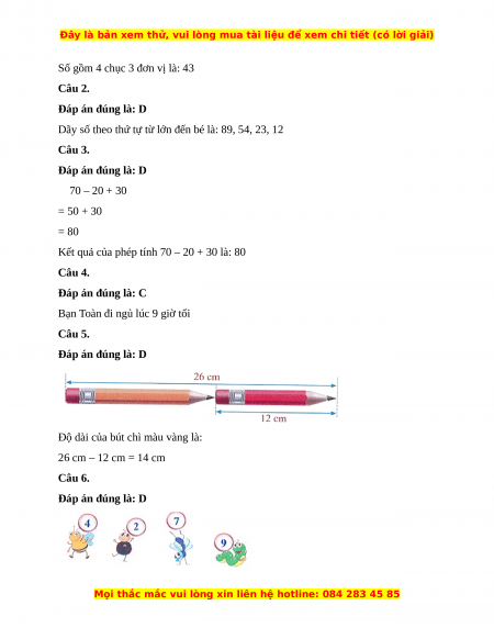 Dãy số theo thứ tự từ lớn đến bé là: 89, 54, 23, 12 Câu 3. Đáp án đúng là: D 70 – 20 + 30 = 50 + 30 = 80