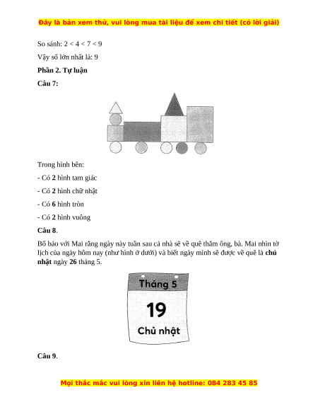 Câu 6. Số lớn nhất là: A. 4 B. 2 C. 7 D. 9 Phần 2. Tự luận