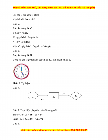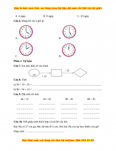 Đồng hồ chỉ 5 giờ là: kim dài chỉ số 12, kim ngắn chỉ số 5. Phần 2. Tự luận Câu 7. 15 24 45 30 + 21