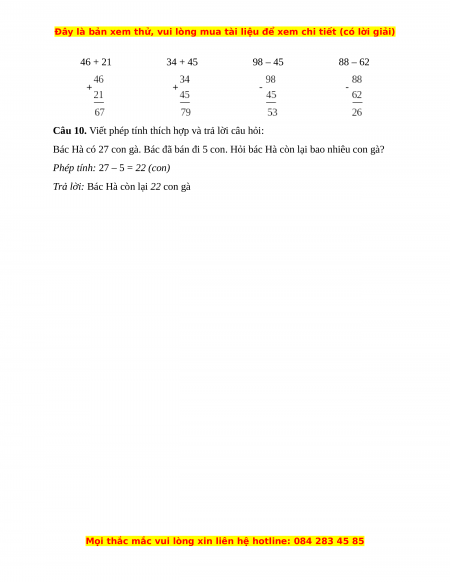 Câu 9. Đặt tính rồi tính 46 + 21 34 + 45 98 – 45 88 – 62 ......................... ......................... ......................... ......................... ......................... ......................... ......................... ......................... ......................... ......................... ......................... ......................... ......................... ......................... ......................... .........................