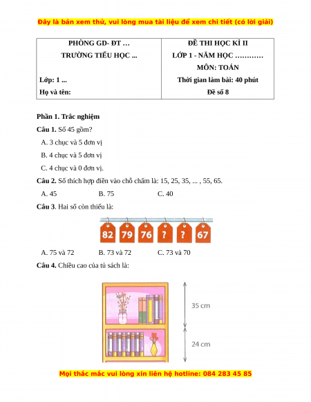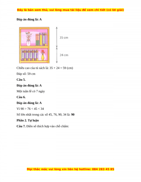 Chiều cao của tủ sách là: 35 + 24 = 59 (cm) Đáp số: 59 cm Câu 5. Đáp án đúng là: A Một tuần lễ có 7 ngày Câu 6. Đáp án đúng là: A Vì 90 > 76 < 45 < 34