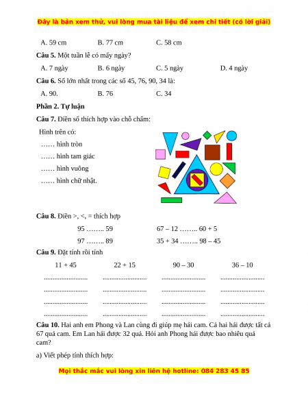 Câu 6. Số lớn nhất trong các số 45, 76, 90, 34 là: A. 90. B. 76 C. 34 Phần 2. Tự luận