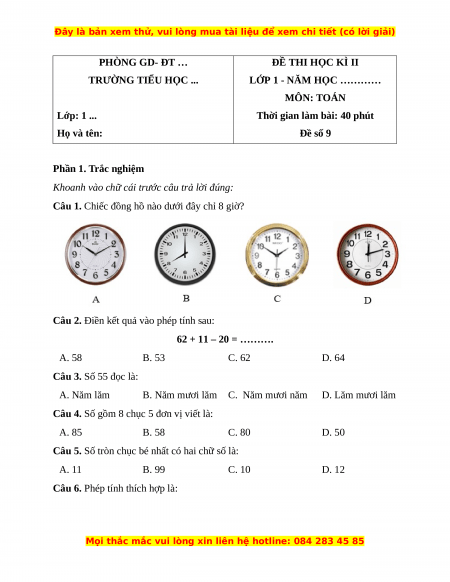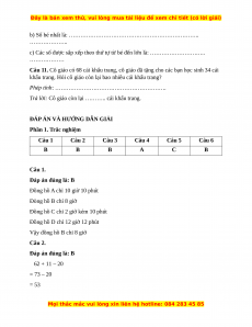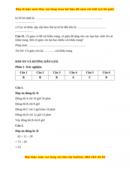 Vậy đồng hồ B chỉ 8 giờ Câu 2. Đáp án đúng là: B 62 + 11 – 20 = 73 – 20 = 53
