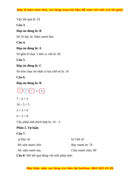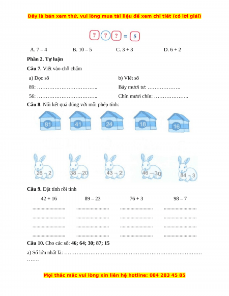 Vậy phép tính thích hợp là: 10 – 5 Phần 2. Tự luận Câu 7. a) Đọc số b) Viết số 89: tám mươi chín Bảy mươi tư: 74 56: năm mươi sáu Chín mươi chín: 99