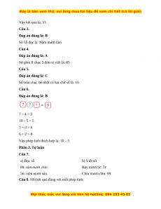 Số tròn chục bé nhất có hai chữ số là: 10 Câu 6. Đáp án đúng là: B 7 – 4 = 3 10 – 5 = 5 3 + 3 = 6 6 + 2 = 8