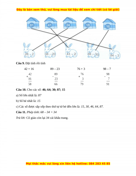 Câu 9. Đặt tính rồi tính 42 + 16 89 – 23 76 + 3 98 – 7 ......................... ......................... ......................... ......................... ......................... ......................... ......................... ......................... ......................... ......................... ......................... ......................... ......................... ......................... ......................... .........................