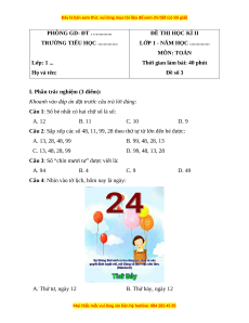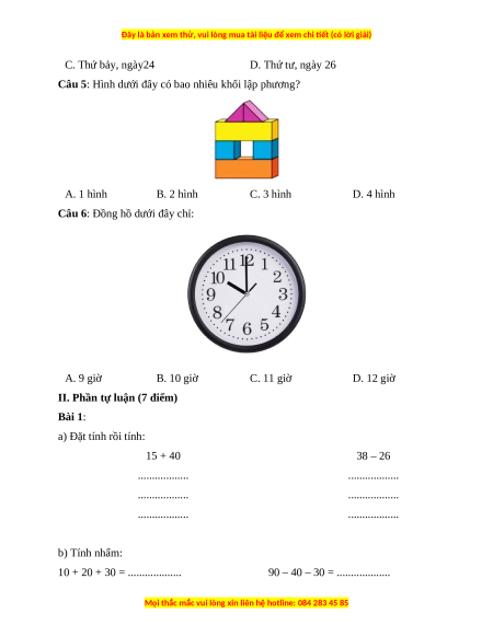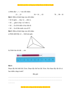 II. Phần tự luận (7 điểm) Bài 1: a) Đặt tính rồi tính: 15 + 40 38 – 26 .................. .................. .................. .................. .................. .................. b) Tính nhẩm: