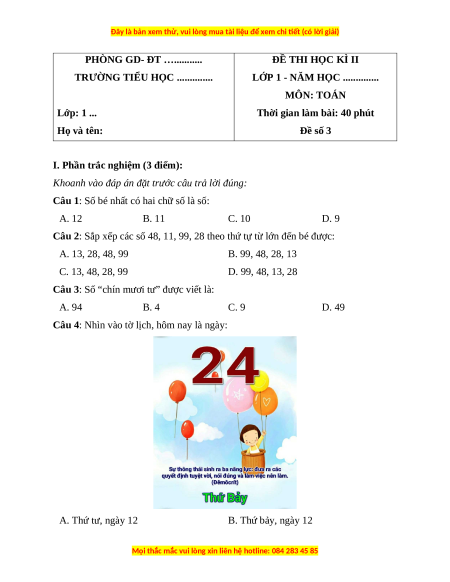 Câu 4: Nhìn vào tờ lịch, hôm nay là ngày: A. Thứ tư, ngày 12 B. Thứ bảy, ngày 12
