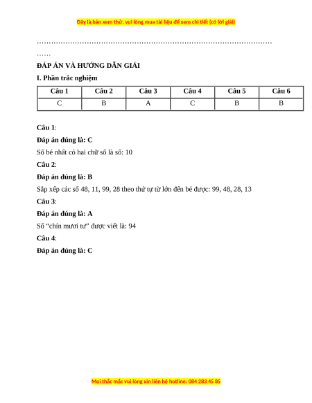 Số “chín mươi tư” được viết là: 94 Câu 4: Đáp án đúng là: C
