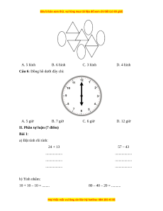 II. Phần tự luận (7 điểm) Bài 1: a) Đặt tính rồi tính: 24 + 13 57 – 43 .................. .................. .................. .................. .................. .................. b) Tính nhẩm: 10 + 10 – 10 = ........ 80 – 40 – 20 = ..........