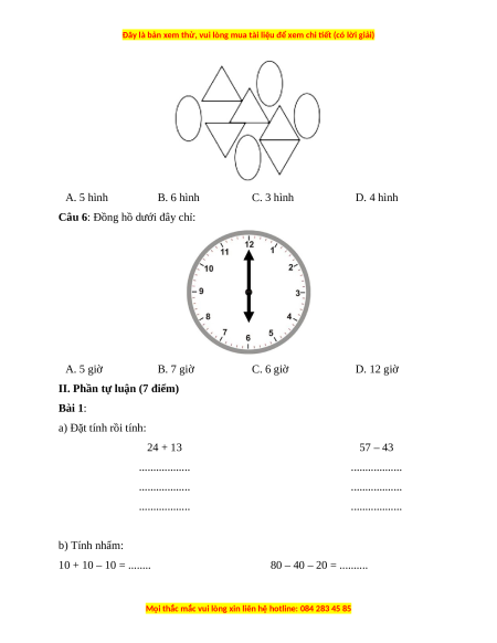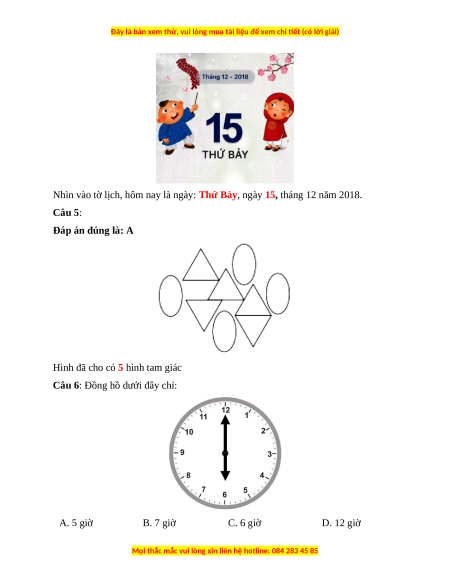 Câu 6: Đồng hồ dưới đây chỉ: A. 5 giờ B. 7 giờ C. 6 giờ D. 12 giờ
