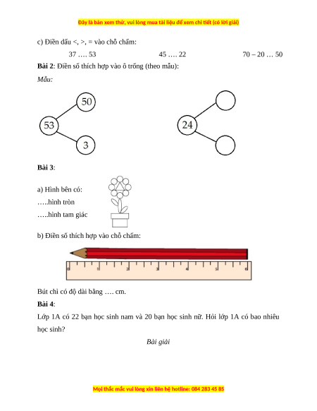 c) Điền dấu <, >, = vào chỗ chấm: 37 …. 53 45 …. 22 70 – 20 … 50