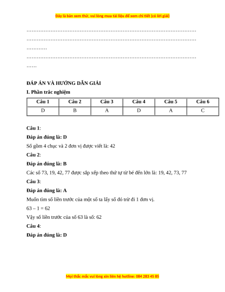 Vậy số liền trước của số 63 là số: 62 Câu 4: Đáp án đúng là: D