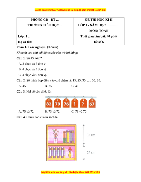 Chiều cao của tủ sách là: 35 + 24 = 59 (cm) Đáp số: 59 cm Câu 5. Đáp án đúng là: A