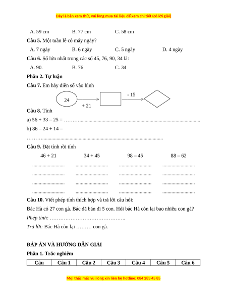 Câu 6. Số lớn nhất trong các số 45, 76, 90, 34 là: A. 90. B. 76 C. 34 Phần 2. Tự luận