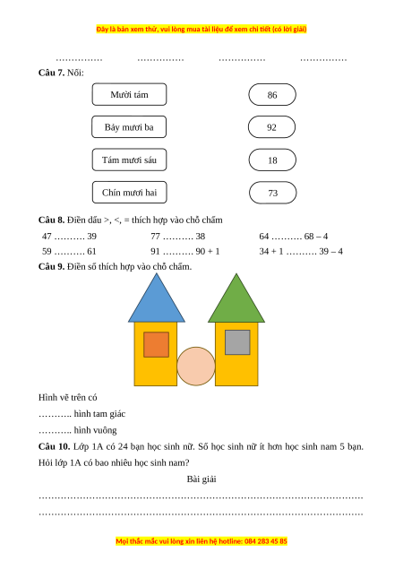 …………… …………… …………… …………… Câu 7. Nối: Mười tám 86 Bảy mươi ba 92 Tám mươi sáu 18 Chín mươi hai 73