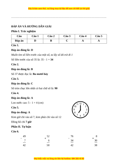 Câu 1. Số liền trước của số 35 là: A. 37 B. 36 C. 33 D. 34
