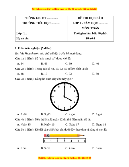 Câu 1 (1 điểm): Số “sáu mươi tư” được viết là: A. 64 B. 46 C. 60 D. 40