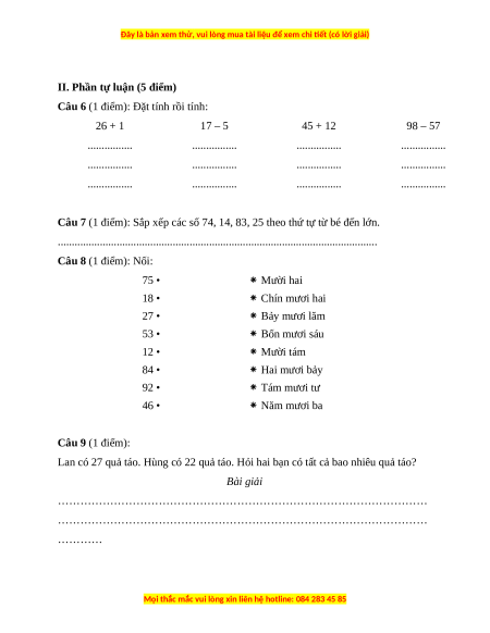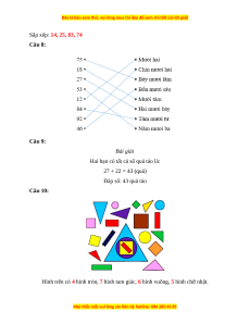 Câu 8 (1 điểm): Nối: 75 • ⁕ Mười hai 18 • ⁕ Chín mươi hai 27 • ⁕ Bảy mươi lăm 53 • ⁕ Bốn mươi sáu 12 • ⁕ Mười tám 84 • ⁕ Hai mươi bảy 92 • ⁕ Tám mươi tư 46 • ⁕ Năm mươi ba Câu 9 (1 điểm):