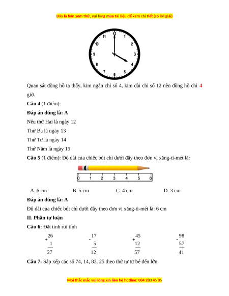 Quan sát đồng hồ ta thấy, kim ngắn chỉ số 4, kim dài chỉ số 12 nên đồng hồ chỉ 4 giờ. Câu 4 (1 điểm): Đáp án đúng là: A Nếu thứ Hai là ngày 12 Thứ Ba là ngày 13 Thứ Tư là ngày 14 Thứ Năm là ngày 15