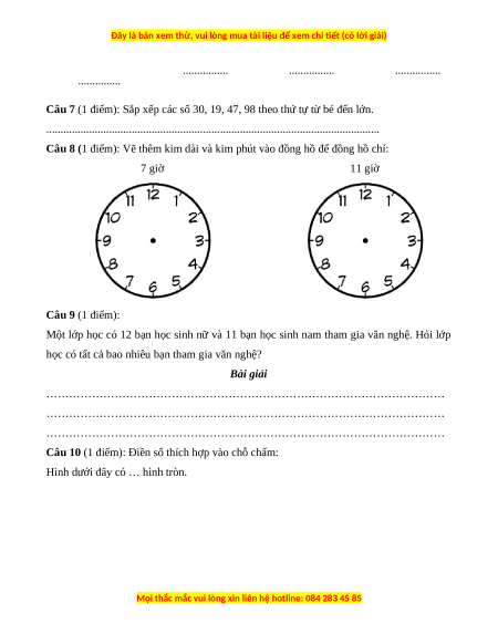 Câu 8 (1 điểm): Vẽ thêm kim dài và kim phút vào đồng hồ để đồng hồ chỉ: 7 giờ 11 giờ Câu 9 (1 điểm):