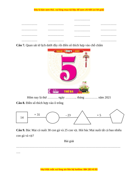 Câu 7. Quan sát tờ lịch dưới đây rồi điền số thích hợp vào chỗ chấm