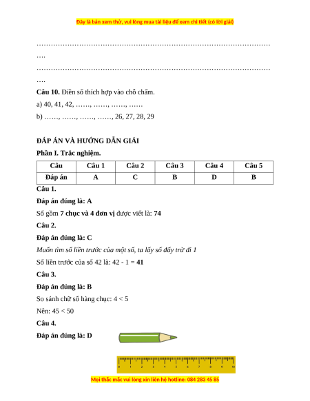 So sánh chữ số hàng chục: 4 < 5 Nên: 45 < 50 Câu 4. Đáp án đúng là: D