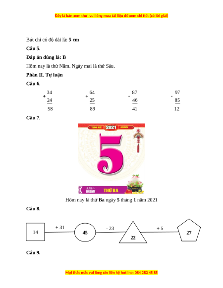 Câu 5. Hôm nay là thứ Năm. Ngày mai là thứ mấy? A. Thứ Tư B. Thứ Sáu C. Thứ Bảy D. Thứ Ba Phần II. Tự luận
