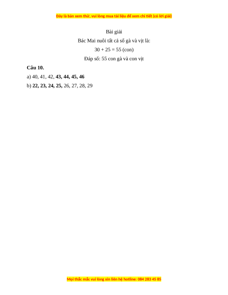 Câu 9. Bác Mai có nuôi 30 con gà và 25 con vịt. Hỏi bác Mai nuôi tất cả bao nhiêu con gà và vịt? Bài giải