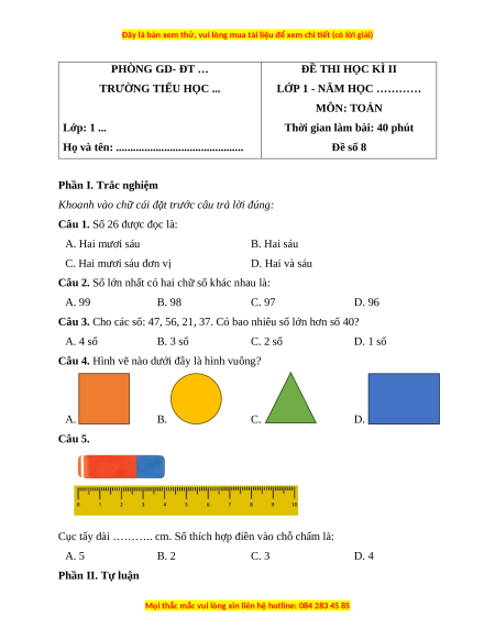Cục tẩy dài ……….. cm. Số thích hợp điền vào chỗ chấm là: A. 5 B. 2 C. 3 D. 4 Phần II. Tự luận