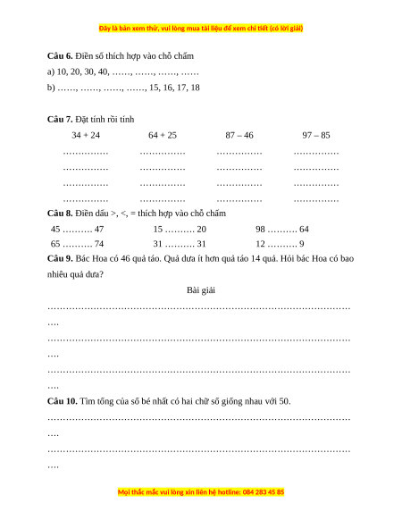 Câu 7. Đặt tính rồi tính 34 + 24 64 + 25 87 – 46 97 – 85 …………… …………… …………… …………… …………… …………… …………… …………… …………… …………… …………… …………… …………… …………… …………… ……………