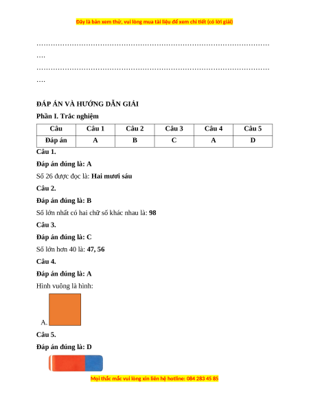 Số lớn hơn 40 là: 47, 56 Câu 4. Đáp án đúng là: A Hình vuông là hình: A. Câu 5. Đáp án đúng là: D