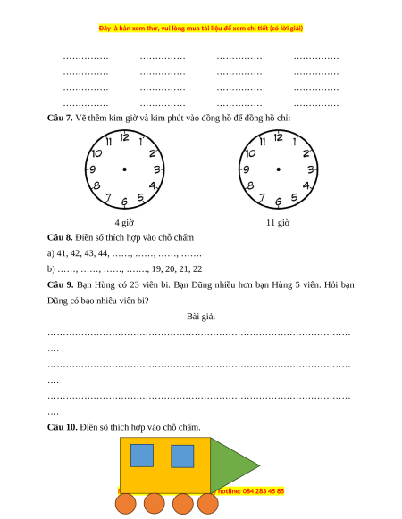 Câu 7. Vẽ thêm kim giờ và kim phút vào đồng hồ để đồng hồ chỉ: 4 giờ 11 giờ