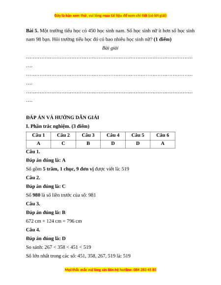 Câu 4. Số lớn nhất trong các số: 451, 358, 267, 519 là: A. 451 B. 358 C. 267 D. 519