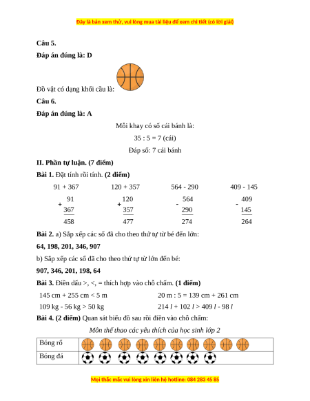 Câu 6. Xếp 35 cái bánh vào 5 cái khay. Hỏi mỗi khay có bao nhiêu cái bánh? A. 7 cái B. 8 cái C. 6 cái D. 5 cái