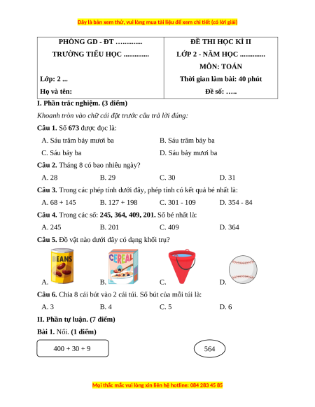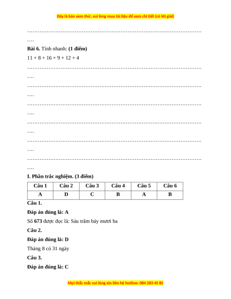 Số 673 được đọc là: Sáu trăm bảy mươi ba Câu 2. Đáp án đúng là: D Tháng 8 có 31 ngày Câu 3. Đáp án đúng là: C
