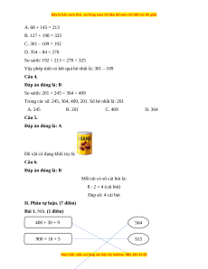 Câu 3. Trong các phép tính dưới đây, phép tính có kết quả bé nhất là: A. 68 + 145 B. 127 + 198 C. 301 - 109 D. 354 - 84