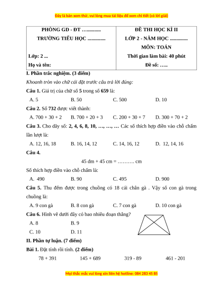 Câu 2. Số 732 được viết thành: A. 700 + 30 + 2 B. 700 + 20 + 3 C. 200 + 30 + 7 D. 300 + 70 + 2