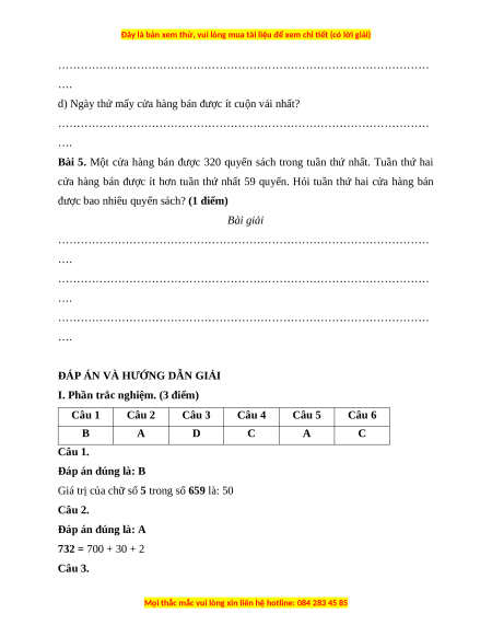 Giá trị của chữ số 5 trong số 659 là: 50 Câu 2. Đáp án đúng là: A 732 = 700 + 30 + 2 Câu 3.