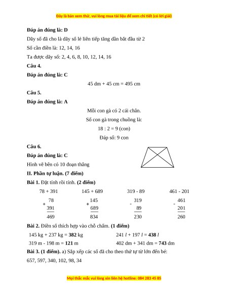 Ta được dãy số: 2, 4, 6, 8, 10, 12, 14, 16 Câu 4. Đáp án đúng là: C 45 dm + 45 cm = 495 cm Câu 5. Đáp án đúng là: A