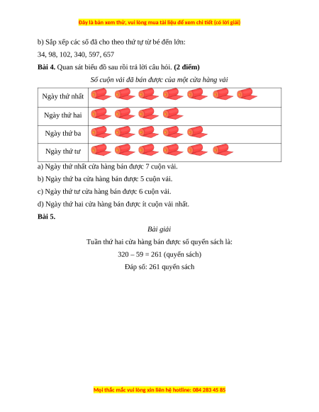 Bài 3. (1 điểm). a) Sắp xếp các số đã cho theo thứ tự từ lớn đến bé: 657, 597, 340, 102, 98, 34