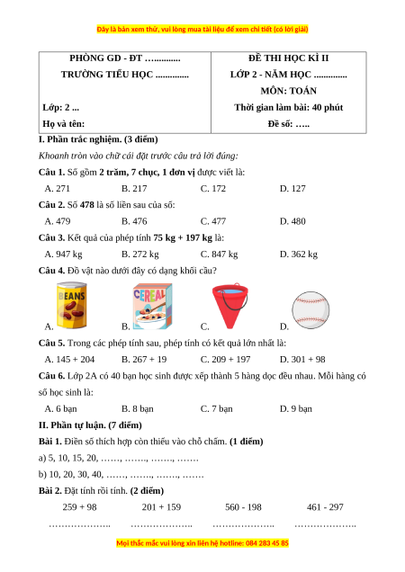 Câu 2. Số 478 là số liền sau của số: A. 479 B. 476 C. 477 D. 480