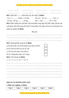 Bài 3. Điền dấu >, <, = thích hợp vào chỗ chấm. (1 điểm) 9 m × 5 > 98 dm + 125 dm 401 cm + 197 cm < 14 m : 2