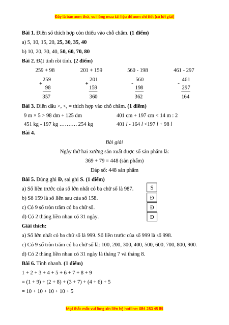 Câu 5. Trong các phép tính sau, phép tính có kết quả lớn nhất là: A. 145 + 204 B. 267 + 19 C. 209 + 197 D. 301 + 98