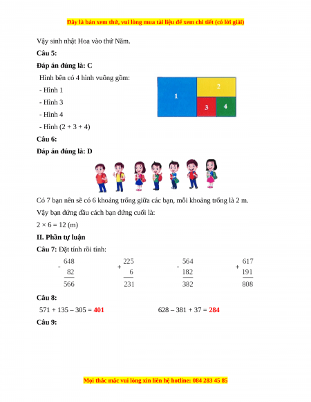 Câu 7: Đặt tính rồi tính: Câu 8: 571 + 135 – 305 = 401 628 – 381 + 37 = 284 Câu 9: