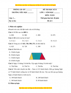 Câu 5: Ngày 15 tháng 3 là thứ Ba. Vậy ngày 8 tháng 3 là thứ mấy? A. Thứ Năm B. Thứ Tư C. Thứ Ba D. Thứ Hai