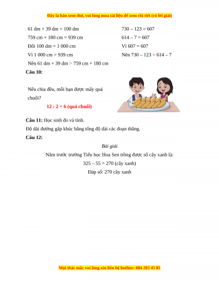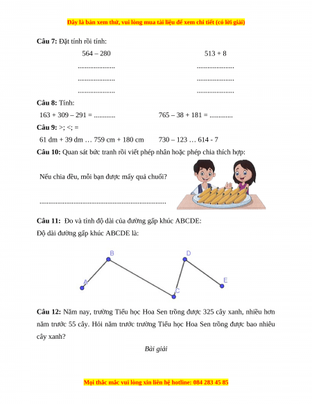 Câu 12: Năm nay, trường Tiểu học Hoa Sen trồng được 325 cây xanh, nhiều hơn