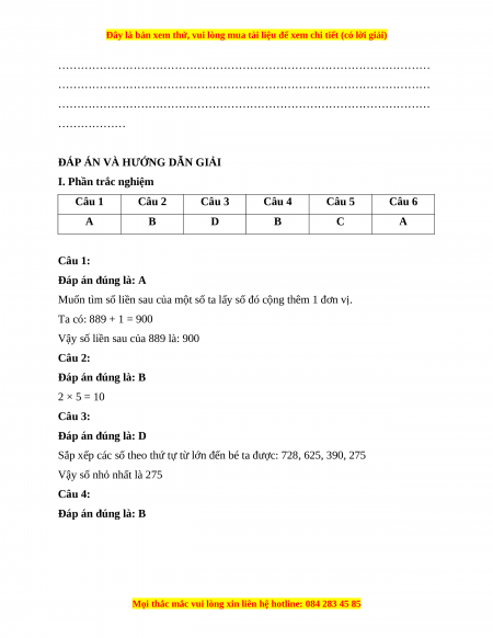 Câu 1: Số liền sau của 889 là: A. 890 B. 900 C. 899 D. 879