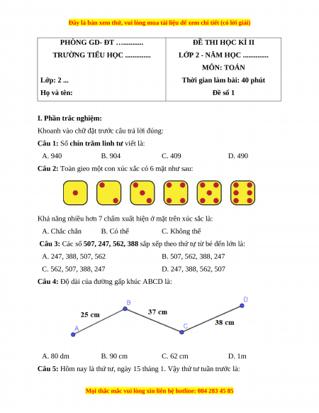 Câu 1: Số chín trăm linh tư viết là: A. 940 B. 904 C. 409 D. 490