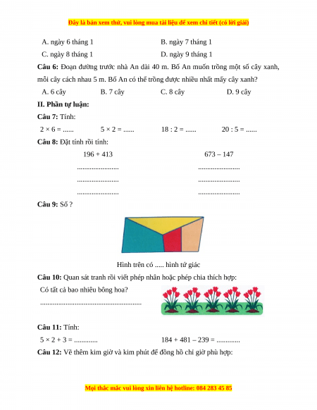 mỗi cây cách nhau 5 m. Bố An có thể trồng được nhiều nhất mấy cây xanh? A. 6 cây B. 7 cây C. 8 cây D. 9 cây II. Phần tự luận: Câu 7: Tính: 2 × 6 = ...... 5 × 2 = ...... 18 : 2 = ...... 20 : 5 = ......